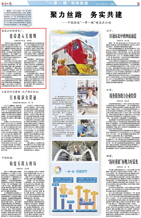 5月17日,国务院主办的中央直属党报《经济日报》及其网站中国经济网上,在题为《“一带一路”样板工程:永新燃煤电厂建设进展顺利》的文章中,报道了中国能建广东院牵头总承包建设的越南永新燃煤电厂一期项目的最新进展,介绍了该项目作为“一带一路”样板工程的重大意义。