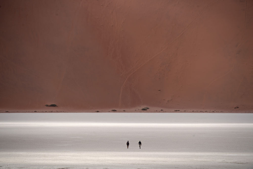 2022年1月16日,在纳米比亚的纳米布-诺克卢福国家公园,游客走在盐沼地中。新华社记者陈诚摄