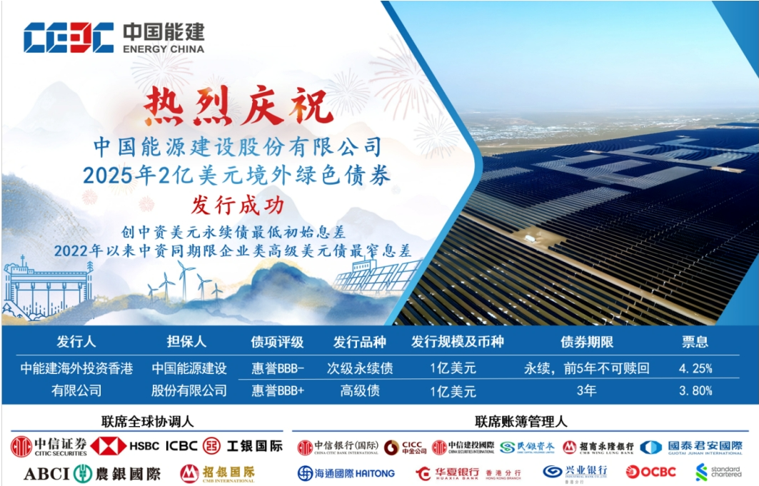 10月21日,由中能建海外投资香港有限公司作为发行人、中国能源建设股份有限公司担保的2亿美元绿色境外债券,在香港成功簿记,成为2025年非金融类中央企业的首单次级永续债和高级债,并创下中资美元永续债最低初始息差、2022年以来同期限企业类高级美元债最窄息差两项市场纪录。同时,这也是中国能建自成立以来首次在国际市场公开发行高级无抵押绿色债券,标志着国际融资渠道拓展取得重大突破。