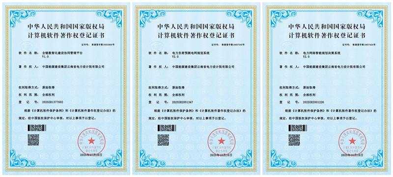近日,中国能建中电工程云南院自主研发的三个软件通过国家版权局鉴定,获得国家计算机软件著作权登记证书。三个软件分别是近“全链数智化建设协同管理平台V1.0”、“电力负荷预测电网规划系统V2.0”、“电力网络智能规划决策系统V2.0”。