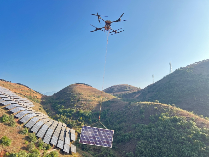 位于河北井陉、云南伍寨等大型山地的光伏项目,无人机化身“空中运输奇兵”。它们紧贴近乎垂直的岩壁,将重达20公斤的光伏支架配件精准投送至半山腰作业点,以“穿针引线”般的灵巧,彻底破解了山地物流困局。
