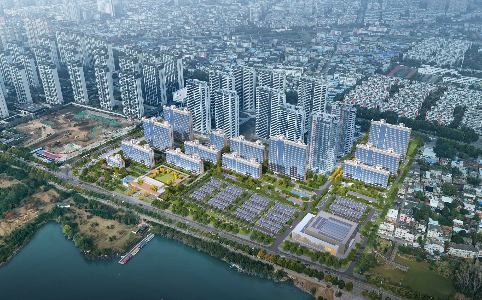 项目位于安徽省淮南市田家庵区,占地面积约112亩,规划总建筑面积10.39万平方米,建设内容涵盖高层住宅以及配套邻里运动中心、光伏停车场、地下车库、道路、绿化、给排水、配电房等完整附属设施,真正实现“居住+配套”一体化。