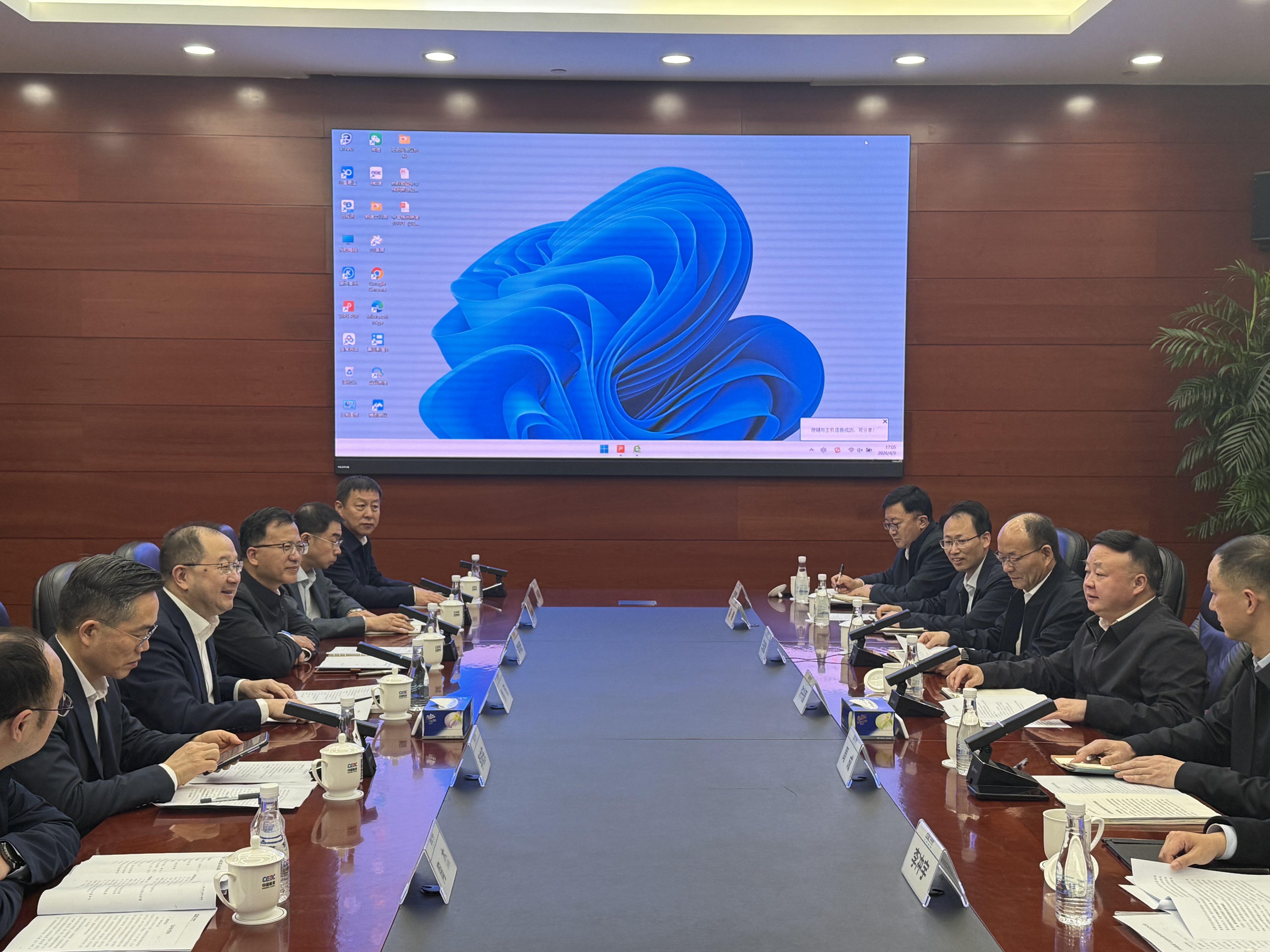 4月9日,中国能建党委常委、副总经理徐陆在公司总部与成都市人民政府副市长许兴国座谈。双方围绕水利水电重大项目建设、综合能源、绿色交通等领域务实合作展开深入交流。